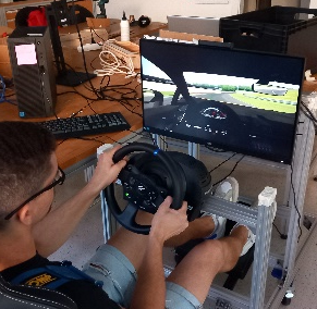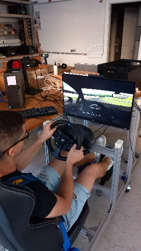 Simulator vožnje je predstavljal korak višje oz. bližje željam študentov na Fakulteti za strojništvo UL. Veliko študentov se zanima za avtomobilizem, bolj natančno za dirkanje z avtomobili. Tukaj se je ekipa odločila, da približa občutke z dirkališča v Peskovniku, saj so razbrali ogromno interesa iz udeležbe na delavnicah Osnove dirkanja z avtomobili. Združili smo moči in skonstruirali in sestavili svoj simulator vožnje. Deluje s pomočjo servo aktuatorjev, ki se jih kontrolira preko krmilnika in programske opreme na računalniku. Simulator podatke zajema iz računalniške igre Assetto corsa in jih nato obdela. Slednje preko računalniškega programa Simhub pretvori v gibanje servo motorjev. Le-ti so povezani na linearna vodila, ki so zmožna premikati celotno konstrukcijo v 3 oseh. Simulator se od drugih razlikuje predvsem po zajemu podatkov. Zajema primarno tiste, ki popisujejo lego pnevmatike in amortizerjev glede na asfalt. Slednji so pomembni za voznika, saj lahko le-ta tako analizira, kdaj dirkalniku spodrsuje in kdaj ne. Voznik ima na sebi VR očala, ki dajejo še bolj pristen občutek za volanom. Tako lahko odpelje kar se da hiter krog in hkrati podoživi približek vožnje na dirkališču.